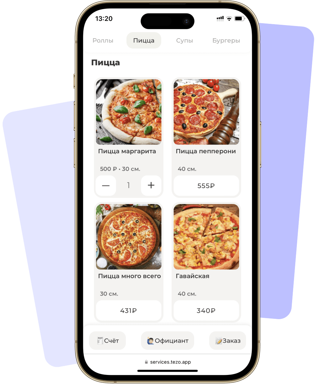 Весь необходимый функционал. Добавить в корзину, открытие карточки блюда, модификаторы, вызов официанта к столу